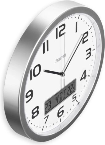 Stilski zidni sat promjera 30 cm spaja tradicionalni analogni prikaz vremena s praktičnim digitalnim zaslonom koji prikazuje datum i trenutačnu temperaturu u prostoriji. Radio-upravljano vrijeme DCF osigurava točnost bez potrebe za ručnim podešavanjem i prelaskom na ljetno vrijeme.