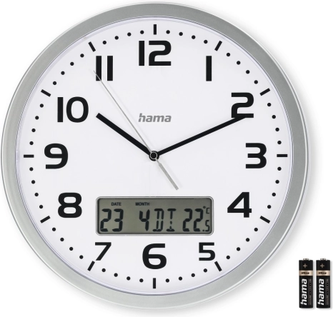 Elegantni zidni sat s tehnologijom DCF radijskog upravljanja kombinira analogni brojčanik s digitalnim zaslonom datuma i temperature. Nudi preglednu bijelu površinu s velikim arapskim brojkama i sekundnom kazaljkom, prebacivanje između °C i °F, izbor među 7 jezika te indikaciju ljetnog vremena. Idealan za moderne interijere.
