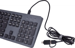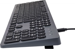 Potpuno opremljena žičana tipkovnica s tihim tipkama. Povezivanje putem USB-A ili USB-C kabela, koji se u slučaju oštećenja lako zamijeni, što povećava trajnost i smanjuje troškove. Sadrži adapter USB-C na USB-A.