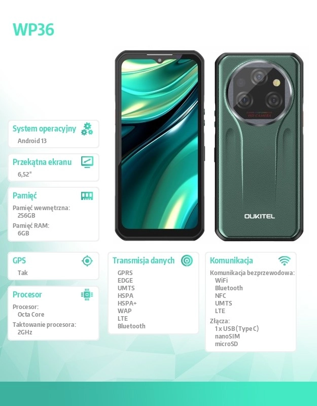 Oukitel WP39 može se pohvaliti velikim 6,6" IPS zaslonom s rezolucijom 2408 x 1080 piksela, koji pruža oštru i svijetlu sliku čak i na suncu. Unutar telefona nalazi se osmojezgreni procesor MediaTek Dimensity 6100+ koji, zajedno sa 6 GB RAM-a, osigurava nesmetan rad i više nego dovoljno snage za sve aplikacije. Interna memorija kapaciteta 256 GB nudi mnogo prostora za vaše datoteke i medije.