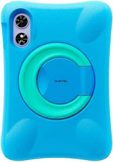 Stalak i ručka osiguravaju da je tablet lako držati i stabilan. Maska štiti uređaj od udaraca i izrađena je od plastike u živim nijansama plave i tirkizne. Na ručki je vidljiv logotip brenda 'OUKITEL'.