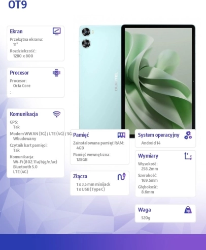 Tablet radi na operacijskom sustavu Android 14 i nudi povezivanje putem Wi‑Fi 802.11 a/b/g/n/ac i Bluetooth 5.0 za brzo i stabilno spajanje. S dimenzijama 259 × 170,6 × 8,7 mm i težinom od 524 g također je lagan i jednostavan za prenošenje.