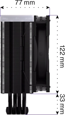 Bakrene toplinske cijevi s izravnim dodirom s CPU‑om i gusto, asimetrično rebrasto tijelo učinkovito odvode toplinu i poboljšavaju kompatibilnost s memorijama.