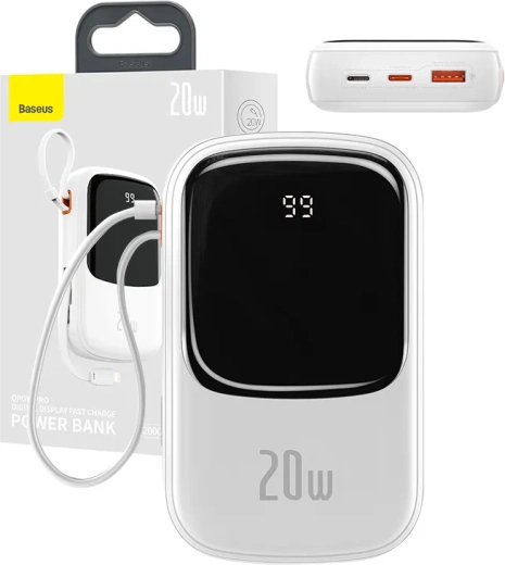 Baseus Qpow Pro je praktična i prostrana power banka opremljena ugrađenim Lightning kabelom, USB-C i USB priključkom. Omogućuje punjenje do triju uređaja istovremeno s izlaznom snagom od 20 W.