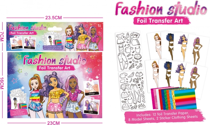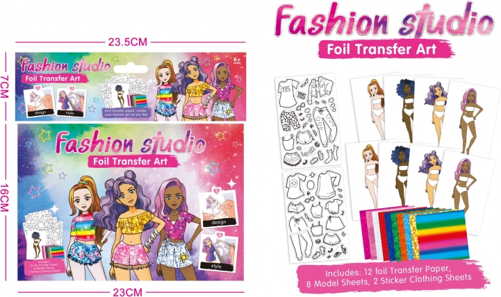 Otkrijte svoju kreativnost pomoću dizajnerskog portfolia, koje uključuje 8 modela, 2 lista šablona odjeće i 12 obojenih ljepljivih folija.