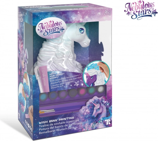 Nebulous Stars Kasica za želje. Set, oboji svoju vlastitu kasicu za želje. Sadržaj pakiranja – kasica, 7 akrilnih boja, sjajni lak s glitterom, 2 kista, 75 kamenčića, mini gel olovka, mini dnevnik, upute.