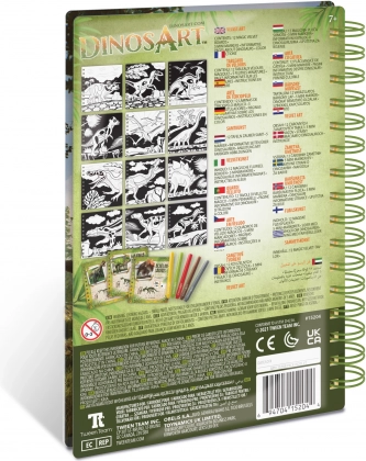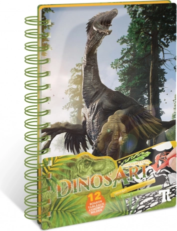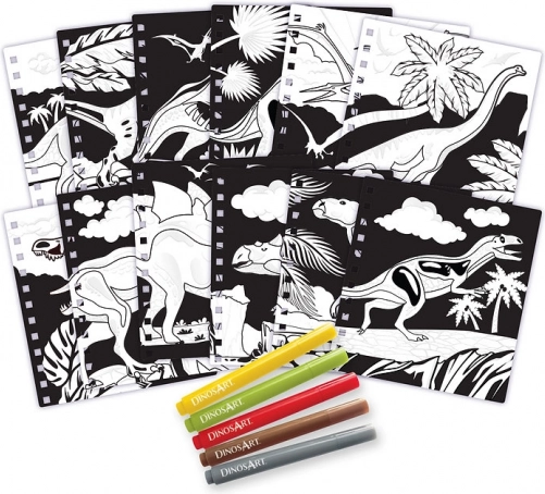 Otkrijte kreativni set za male paleontologe: baršunaste bojanke DINOSART sa svijetom dinosaura. Pakiranje sadrži 12 čarobnih baršunastih ploča, 5 mini flomastera, jasne upute i informativne stranice o dinosaurima – idealno za zabavu i učenje bez prelaska boja preko kontura.