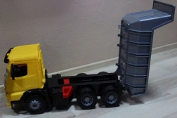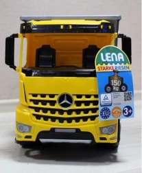 Ovaj dječji kiper Mercedes Giants Dump Truck nudi nevjerojatnu zabavu za djecu. Model AROCS je troosovinski s realističnim dizajnom, uključujući žutu kabinu, crno podvozje i srebrnu prikolicu.