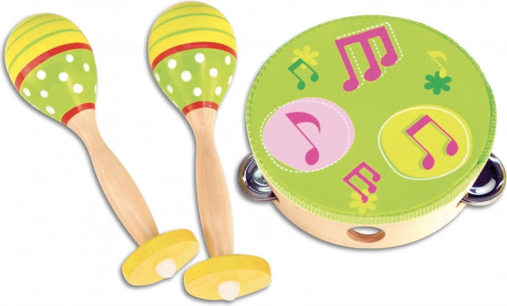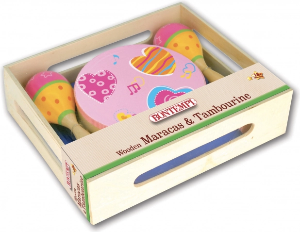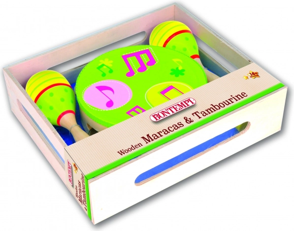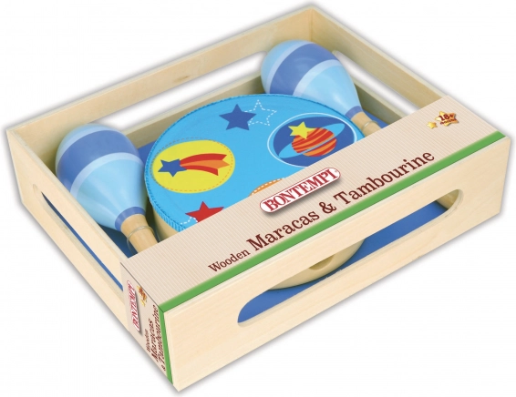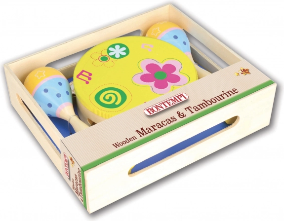 Dječji glazbeni set BONTEMPI: 2 drvene rumbakase i tamburin s 8 činela. Poticanje ritma i motorike. Prikladno od 1,5 godine.