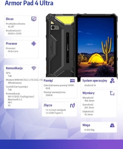 Ulefone Armor Pad 4 Ultra 5G dizajniran je za maksimalnu izdržljivost i funkcionalnost. Uređaj je opremljen najnovijim tehnologijama i robusnim dizajnom, što ga čini izvrsnim izborom za terensku uporabu. S certifikatom IP69K otporan je na prašinu i uranjanje u vodu.