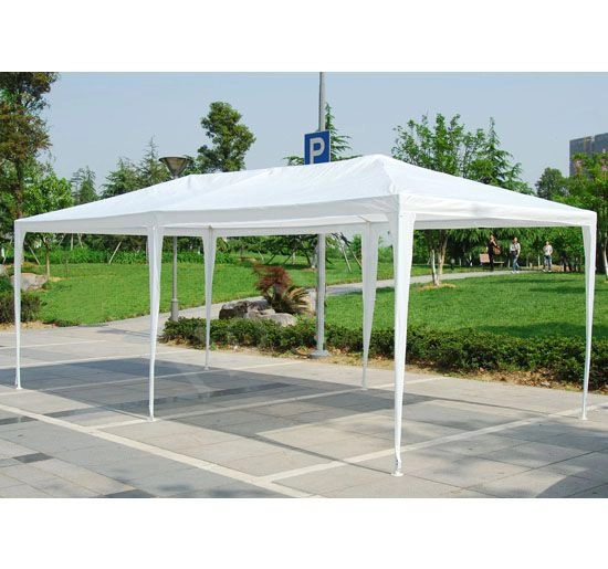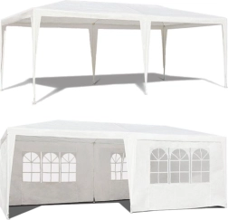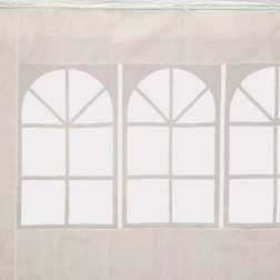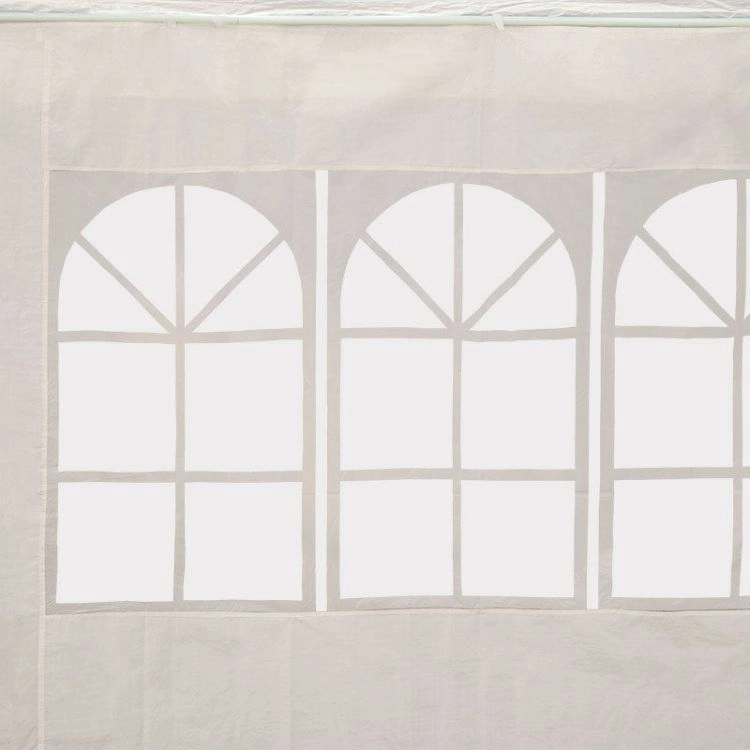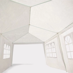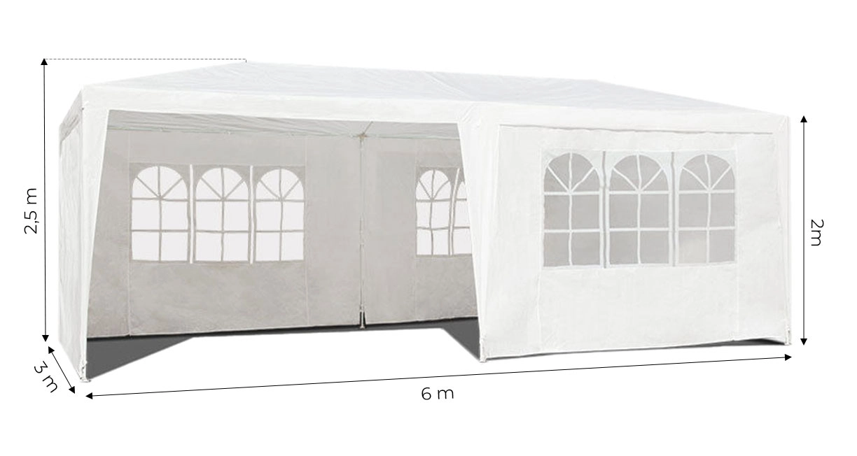 Konstrukcija od gustih metalnih cijevi s praškastim lakiranjem promjera 32/25/25 mm osigurava stabilnost i otpornost na koroziju. Svaka noga šatora pričvršćena je klinovima za veću stabilnost. Krov i stijenke izrađeni su od izdržljive PE tkanine (100 g/m2) u elegantnoj bijeloj boji.