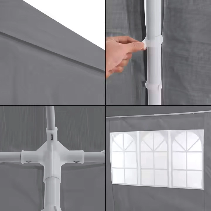 Okvir je izrađen od debelih metalnih cijevi s praškastim premazom. Svaka noga je čvrsto učvršćena u tlo. Krov i stijenke su od izdržljivog PE materijala gramature 100 g/m2 u elegantnoj sivoj boji.
