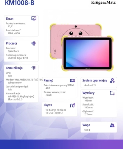 Tablet Krüger&Matz FUN 1008 pruža jedinstveno iskustvo za djecu zahvaljujući ružičastom dizajnu i zaštitnim elementima. Zaslon s rezolucijom 1280 x 800 piksela i omjerom stranica 16:9 nudi svijetle i vjerne boje zahvaljujući IPS tehnologiji. Idealan je za djecu zbog širokih kutova gledanja.