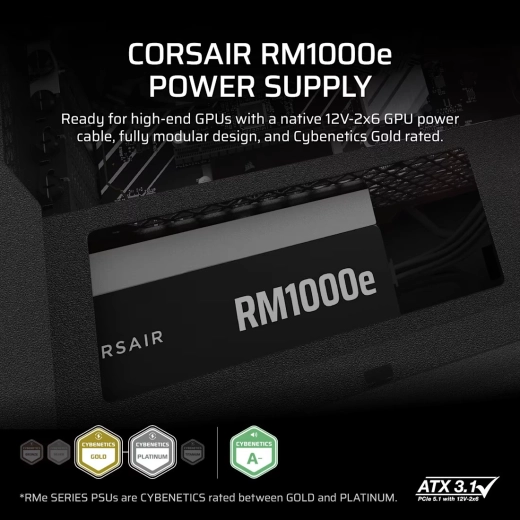 Potpuno modularno napajanje Corsair RM1000e ATX nudi tihi rad i visoku učinkovitost s certifikatom Cybenetics Gold. Idealno za zahtjevne grafičke kartice i sučelja ATX 3.1, PCIe 5.1.