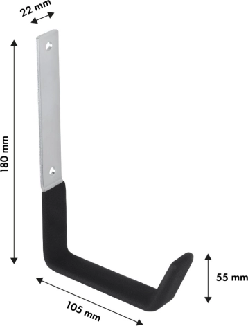 Montaža je brza i jednostavna – ploča s dvije montažne rupe čvrsto stoji na zidu, a kuka podnosi svakodnevno opterećenje. Praktične dimenzije 180 × 105 × 55 mm i ergonomski oblikovan, gumirani dio kuke povećavaju sigurnost i udobnost korištenja.