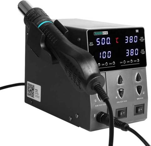 Sugon 212 kombinira toplinski zračnu stanicu i lemilicu T12, što ga čini sveobuhvatnim alatom za popravke i montažu elektronike. Omogućuje ne samo precizno lemljenje, već i jednostavno odlemljivanje i ugradnju SMD komponenti. Tri programabilne tipke omogućuju vam spremanje optimalnih postavki temperature i protoka zraka.