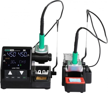 Sugon T60 je snažna digitalna lemna stanica za profesionalce i zahtjevne hobiste. Zahvaljujući proširenju TJ8 možete raditi s dvije ručke istovremeno, prebacivati kanale i održavati visoku produktivnost bez nepotrebnih zastoja. Široka kompatibilnost s držačima T115, T210 i T245 (s grijačima serije C470) pokriva fino SMD lemljenje i rad na masivnim spojevima.