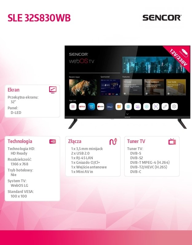 Praktično dvojno napajanje 230 V / 12 V (adapter u pakiranju) proširuje mogućnosti uporabe – idealno za karavan, brod ili vikendicu. Bogata povezivost s 3× HDMI (1× ARC, CEC), 2× USB, LAN, CI+ i 3,5 mm izlazom omogućuje povezivanje konzole, diska i soundbara. Zvuk s podrškom za Dolby Digital Plus i snagom 18 W pruža solidnu glasnoću i razumljivost dijaloga.