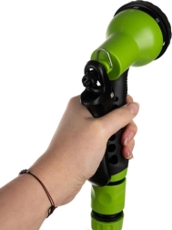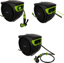 - Kompletan set – sadrži sve potrebno: automatski namotač, crijevo 25 m, pištolj sa 7 funkcija, nastavke, priključke, zidni nosač s okretanjem od 180° i čak 2 m dovodnog crijeva.