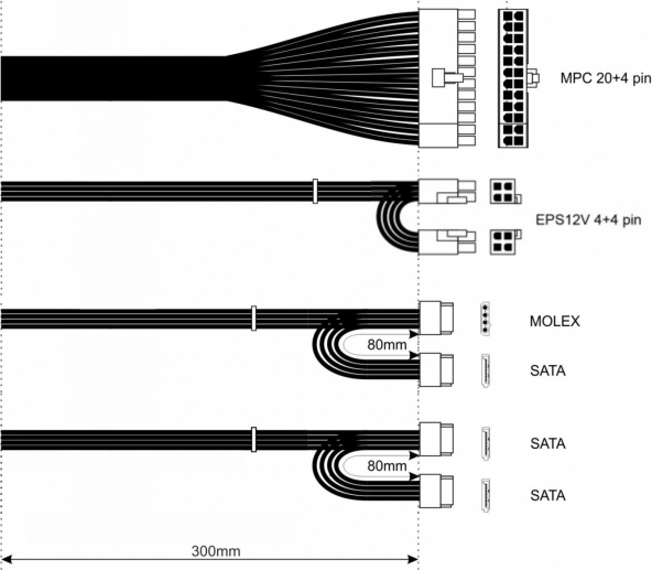 - 4-pin, MOLEX, 3x SATA, 24-pin