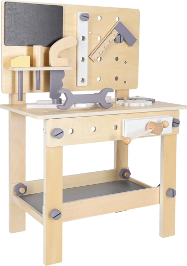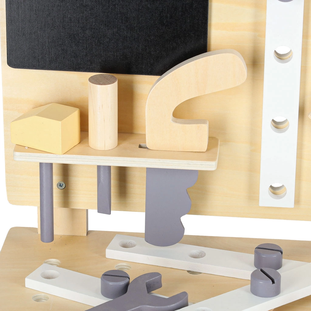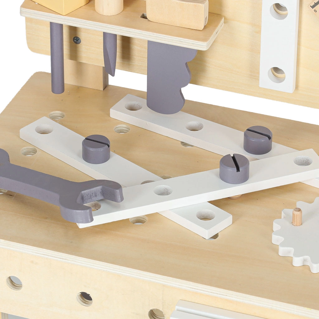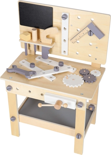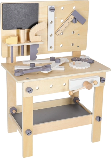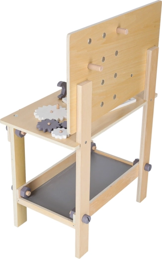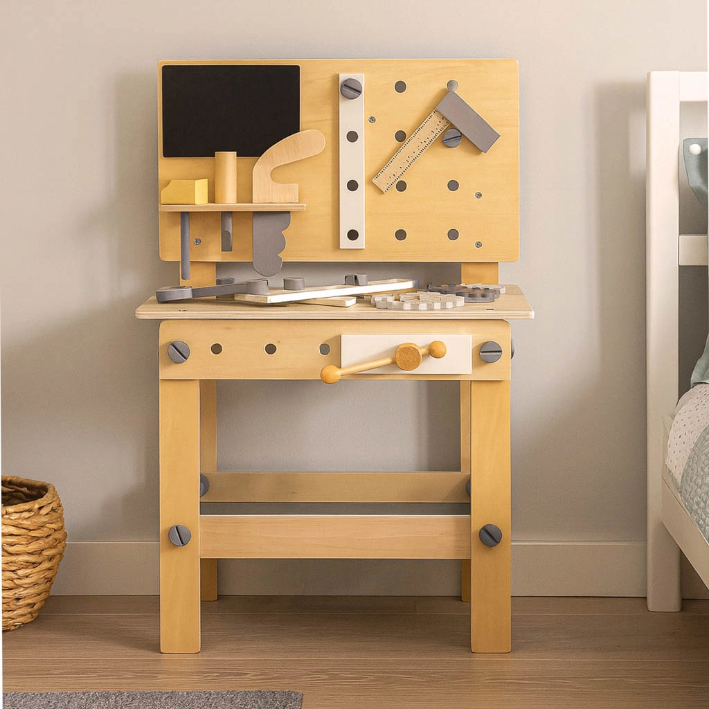 Stilski drveni radni stol za male majstore donosi sate kreativne igre i učenja. U kompletu su čekić, odvijač, ključ, pila, mjerilo, vijci, matice, zupčanici i funkcionalna stega. Čvrsta konstrukcija, polica za odlaganje i perforirana ploča potiču red, kao i razvoj fine motorike i logičkog razmišljanja.