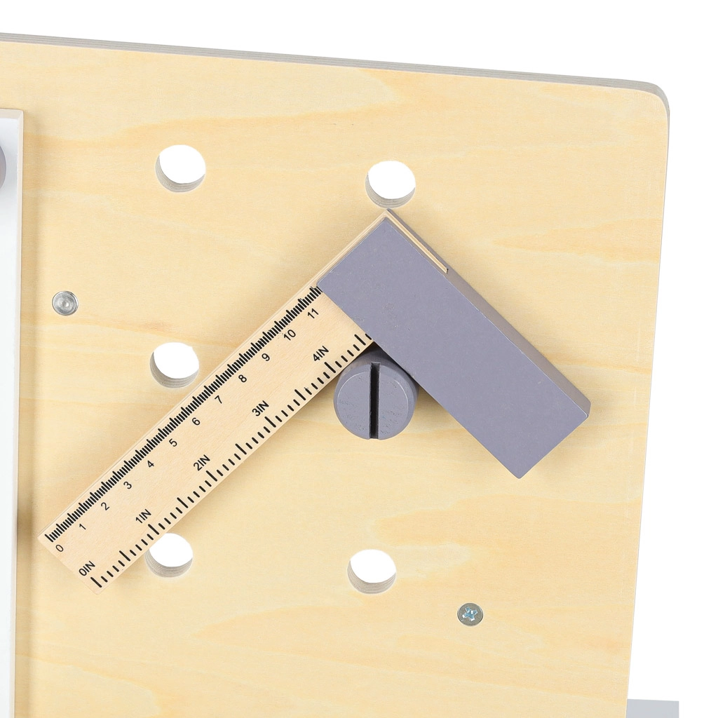 Funkcionalna ručka stege i ploča s otvorima omogućuju djeci sigurno pričvrstiti dijelove i vježbati osnovne vještine kao pri pravom radu u radionici.