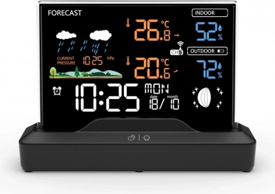 Moderna bežična meteorološka stanica s kolor LCD zaslonom donosi precizno mjerenje temperature i vlažnosti u zatvorenom i na otvorenom, barometar za praćenje tlaka, radijski upravljeni sat s alarmom te prognozu vremena za 12–24 h. Zahvaljujući bežičnom senzoru do 30 m i podesivom pozadinskom osvjetljenju lako očitavate vrijednosti danju i noću.