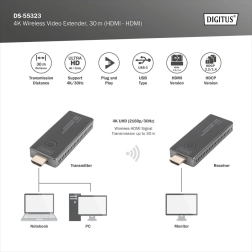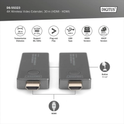 Bežični HDMI ekstender Digitus prenosi video i zvuk u kvaliteti UHD 4K/30 Hz do 30 m bez potrebe za razvlačenjem kabela. Nudi jednostavno Plug & Play povezivanje, stabilnu point‑to‑point vezu i napajanje putem USB‑C, idealno za kućno kino, prezentacije i poslovne sastanke.