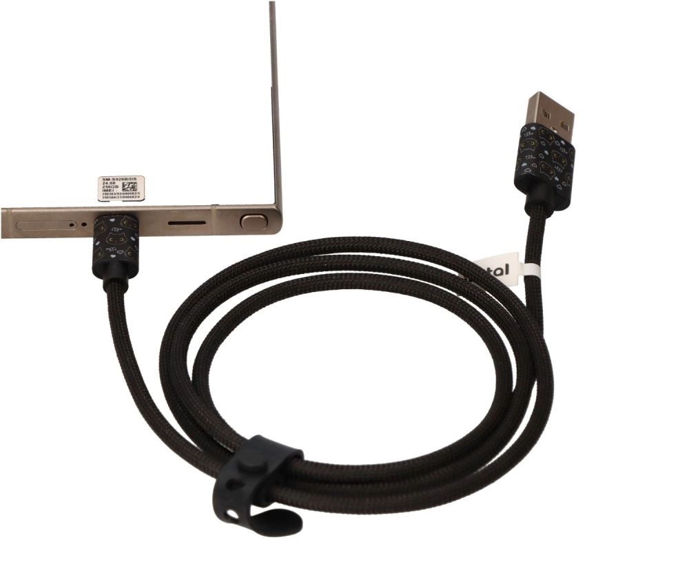 Uživajte u udobnom punjenju s originalnim USB‑C kabelom ukrašenim motivom crne mačke. Uz priloženu silikonsku traku lako ćete prilagoditi duljinu kabela trenutačnim potrebama i spriječiti zapetljavanje u torbi ili na radnom stolu.