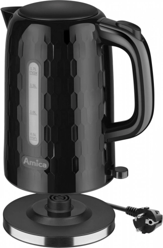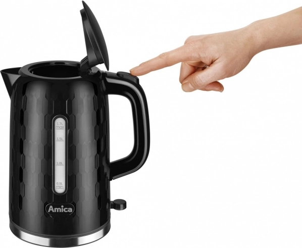 Moderno kuhalo Amica u elegantnoj crnoj boji s teksturiranom, saćastom površinom postat će pouzdan pomoćnik za brzo zagrijavanje vode. Zahvaljujući zapremnini od 1,7 l, bez problema će poslužiti cijelu obitelj, dok ravni grijaći element olakšava čišćenje i omogućuje učinkovito zagrijavanje.