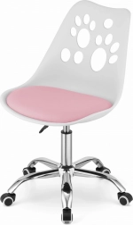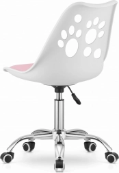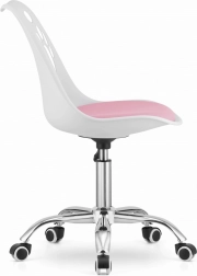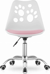 Jedinstven dizajn s bijelim naslonom i ružičastim sjedištem. Stolica ima stabilnu bazu s kromiranim efektom i kotačiće za kretanje.