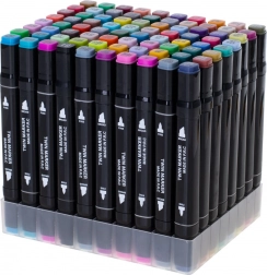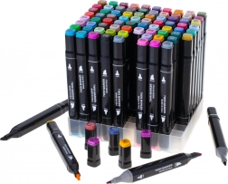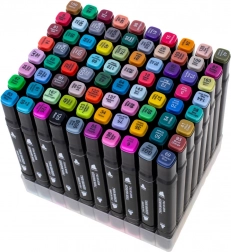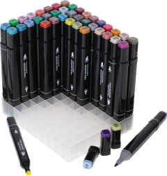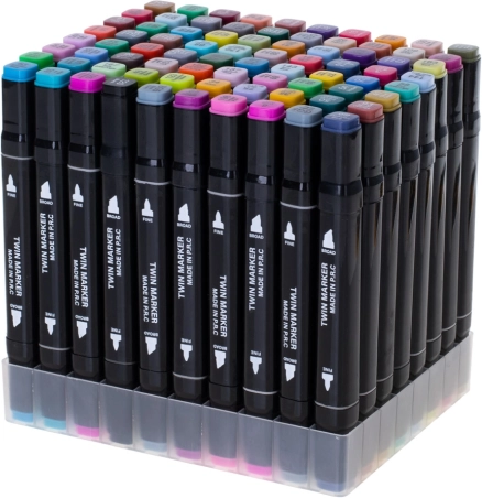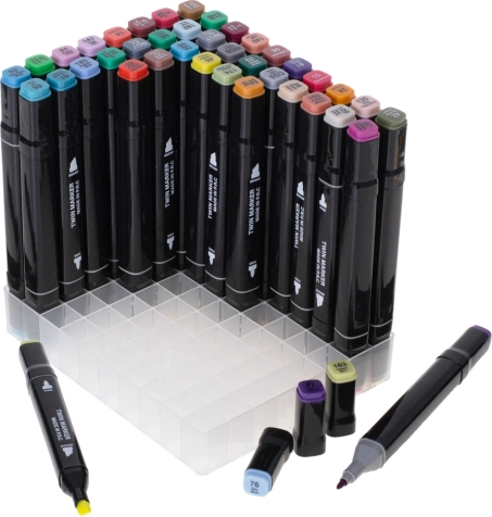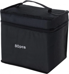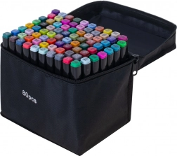 Praktično plastično postolje drži flomastere uredno razvrstane, a tekstilna futrola s patentnim zatvaračem štiti ih i olakšava prenošenje.