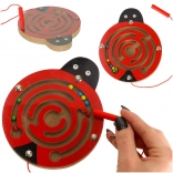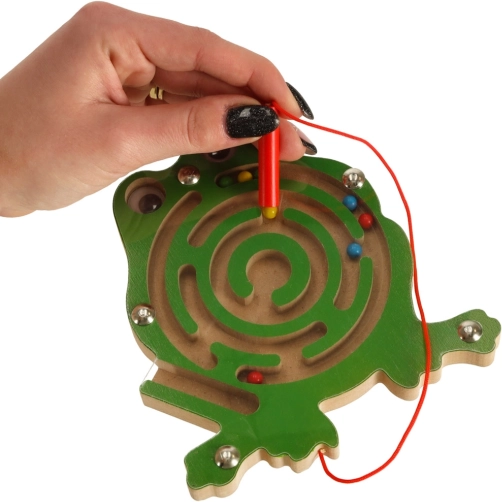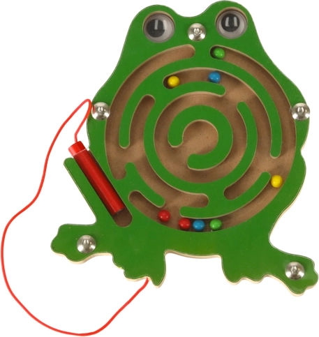 Zabavni drveni magnetski labirint u obliku simpatične žabe razvija finu motoriku, logičko razmišljanje i koordinciju oko–ruka. Uz pomoć magnetske olovke djeca pomiču šarene kuglice prema središtu ili po stazama te vježbaju koncentraciju i prepoznavanje boja. Prozirni pokrov drži kuglice sigurno unutra.