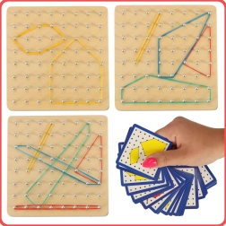 Drveni geoboard – edukativni geoplan s raznobojnim gumicama i kartama s uzorcima