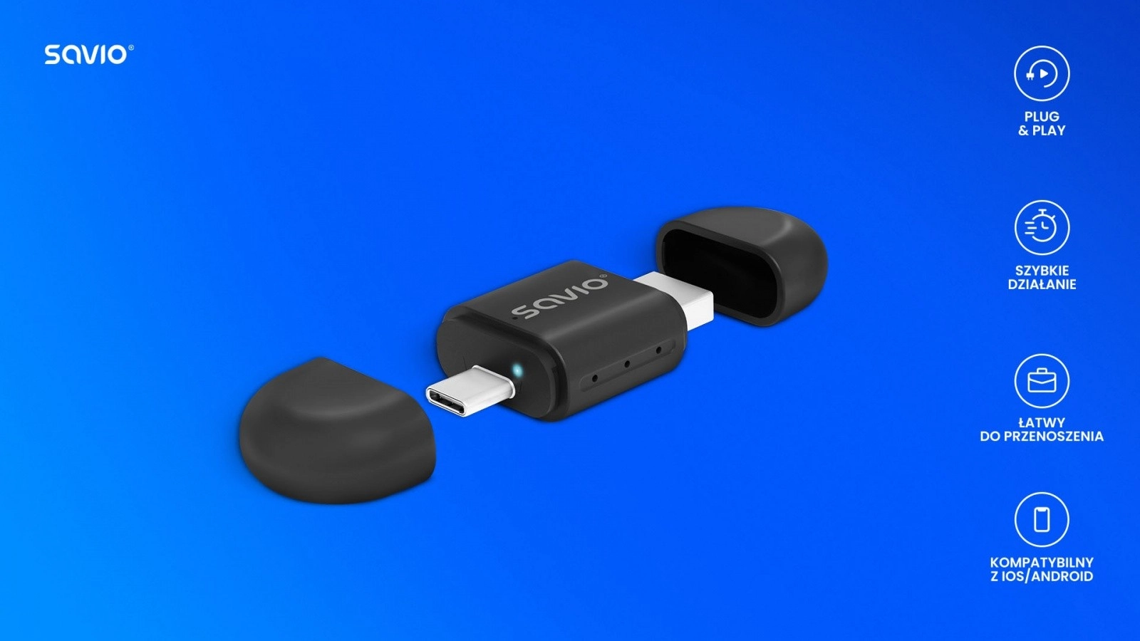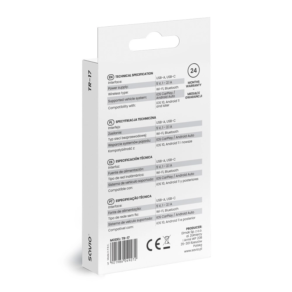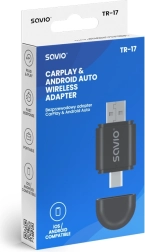 Bežični adapter Savio TR-17 omogućuje vam korištenje omiljenih aplikacija, navigacije, glazbe i glasovnog upravljanja putem CarPlaya i Android Auta bez potrebe za povezivanjem telefona kabelom. Podatke prenosi preko Wi‑Fija, a uparuje se putem Bluetootha, pa su pokretanje i obnova veze brzi i pouzdani.