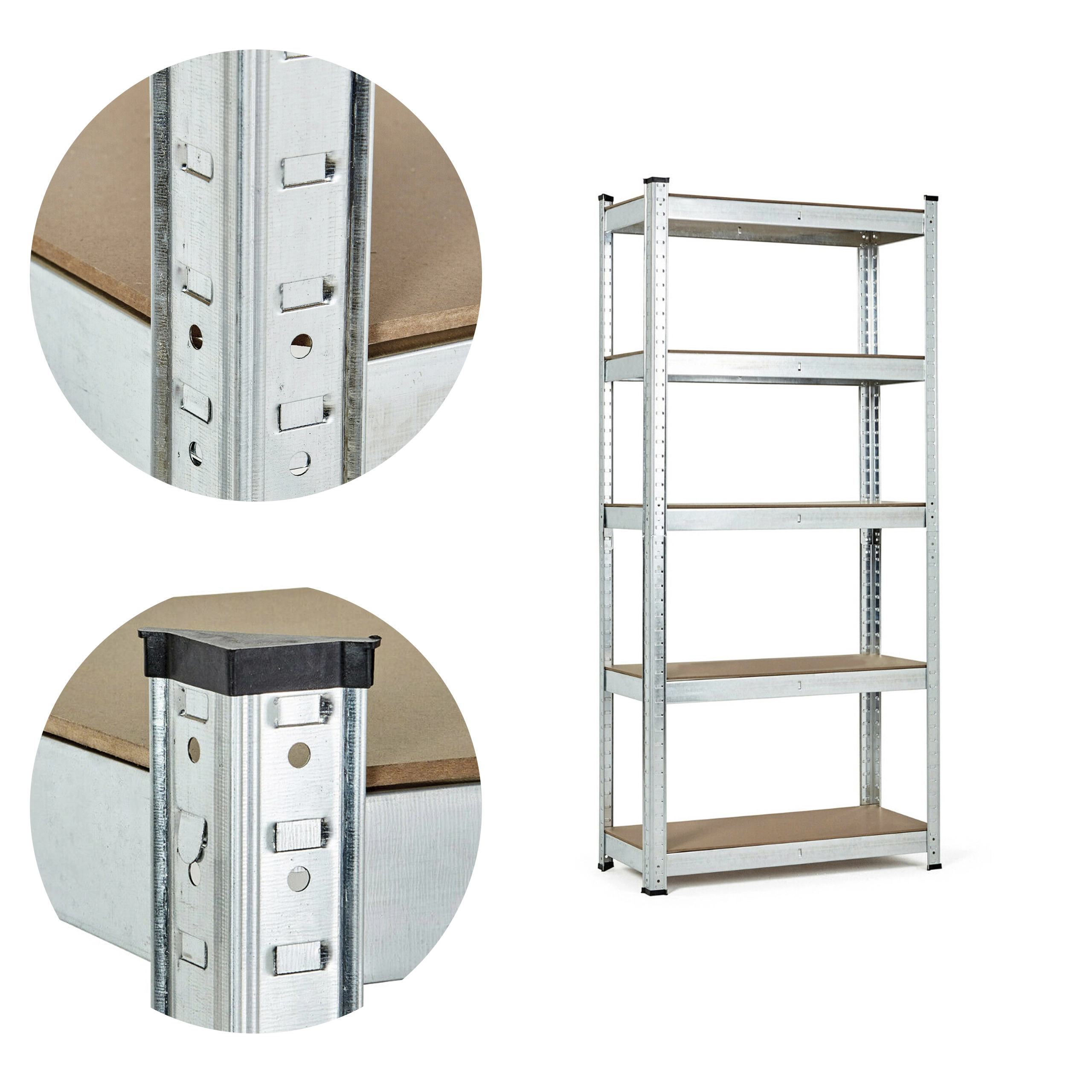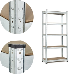 Konstrukcija od pocinčanog čelika štiti regal od vlage i korozije, što ga čini idealnim za uporabu i u okruženjima s povišenom vlagom. Sustav sastavljanja na principu umetanja "zubi" u otvore osigurava jednostavnu montažu i visoku stabilnost čak i pri velikom opterećenju. Zaštitne nožice sprječavaju oštećenje poda.