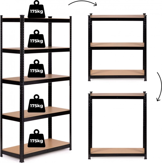 Polica ima 5 izdržljivih polica koje se mogu montirati na bilo kojoj visini, što omogućuje prilagodbu rasporeda prema vašim potrebama. Konstrukcija je ojačana dodatnom središnjom gredom ispod svake police radi osiguravanja stabilnosti.