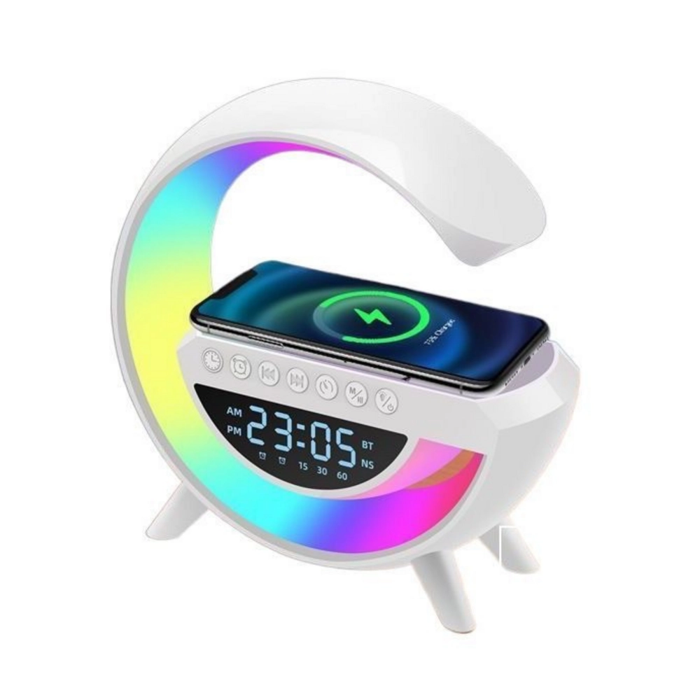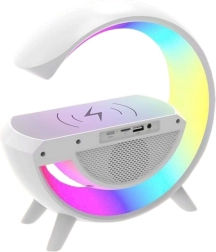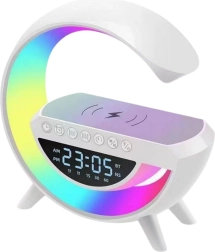 Moderna noćna lampica G63 idealna je oprema za svaku spavaću sobu, dječju sobu ili ured. Kombinira funkcije pametne rasvjete, budilice, zvučnika i indukcijskog punjača, pružajući udobnost i funkcionalnost u jednom elegantnom uređaju. Zahvaljujući simulaciji izlaska sunca, buđenje je prirodnije i ugodnije, što pridonosi boljem osjećaju već od jutra. Mogućnost kontinuirane regulacije svjetline i odabir različitih kolor režima omogućuju prilagodbu atmosfere svakoj situaciji – od opuštanja prije spavanja do jutarnjeg buđenja.