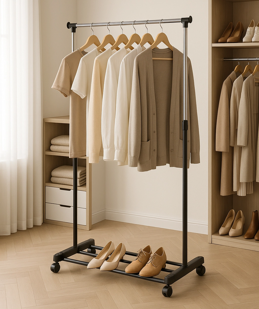 Samostojeći stalak za odjeću je praktičan način za spremanje odjeće i obuće, što ga čini sjajnim dodatkom za svaku garderobu, spavaću sobu ili hodnik u vašem domu ili stanu. Zbog univerzalnog dizajna odgovara modernim i klasičnim interijerima, tako da ne samo da pruža funkcionalnost, već i estetski nadopunjuje vašu dekoraciju.