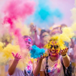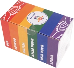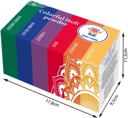 U pakiranju se nalazi šest izražajnih nijansi: bijela, narančasta, žuta, zelena, plava i ljubičasta. Set je odličan izbor za Holi festival, tematske zabave, teambuildinge i promotivne događaje. Prah je periv i lako se uklanja s većine tkanina.