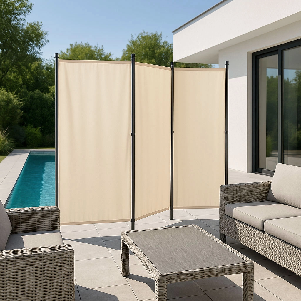 Sklopiva vrtna pregrada MultiGarden je svestrano rješenje za zaštitu i dekoraciju vanjskih prostora. Odlično pristaje u vrt, na terasu ili balkon, gdje pruža privatnost i zaštitu od vjetra, a ujedno služi kao razdjelnik prostora. Zahvaljujući upotrebi izdržljivog poliestera 160 g/m², pregrada je otporna na UV zračenje i kišu. S laganim i sklopivim dizajnom lako ju je premještati i prilagoditi prema potrebi. Elegancija u bež boji daje stil i podiže estetski dojam.