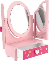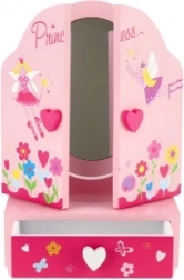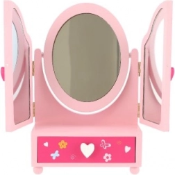 Drveni toaletni stolić sa škrinjicom za nakit Princess izvrstan je dodatak dječjoj sobi. Središnje ovalno ogledalo nadopunjuju dva bočna krila za udobno podešavanje kuta. U donjem dijelu nalazi se praktična ladica u koju djeca mogu spremiti svoje male dragocjenosti. Nježni ukrasi s motivima vila, cvjetova i srca potiču maštu i radost u igri.
