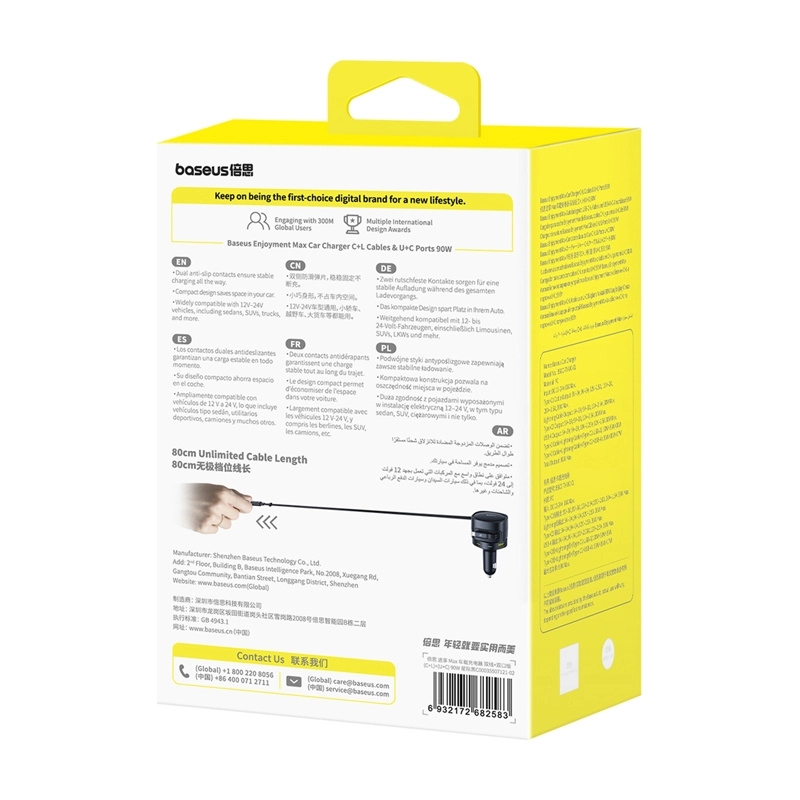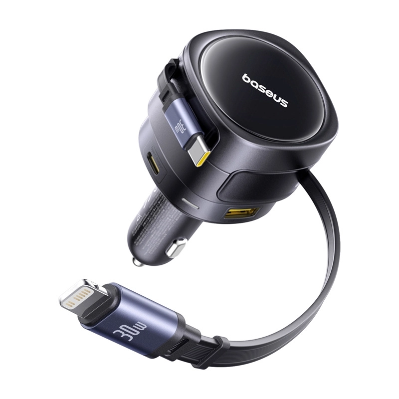 Baseus punjač za auto nudi mogućnost punjenja četiri uređaja) odjednom zahvaljujući dvama ugrađenim kablovima (USB-C i Lightning) zajedno s još dvama portovima (USB-C i USB-A).