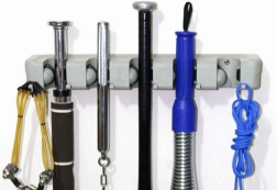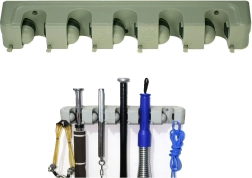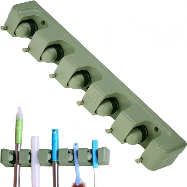 Zidni držač za krpe i metle je idealan pomoćnik za svako kućanstvo ili garažu. S pet podesivih utora i šest malih kuka nudi dovoljno prostora za pohranu četki, krpa i drugih alatki za čišćenje. Izrađen od izdržljive plastike, čvrsto drži različite promjere štapova, stoga je prikladan za široku paletu kućnih i vrtnih potreba.