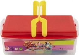 Plastična kutija s crvenim poklopcem i žutom drškom za jednostavno prenošenje i skladištenje modelina, kalupa i valjka.