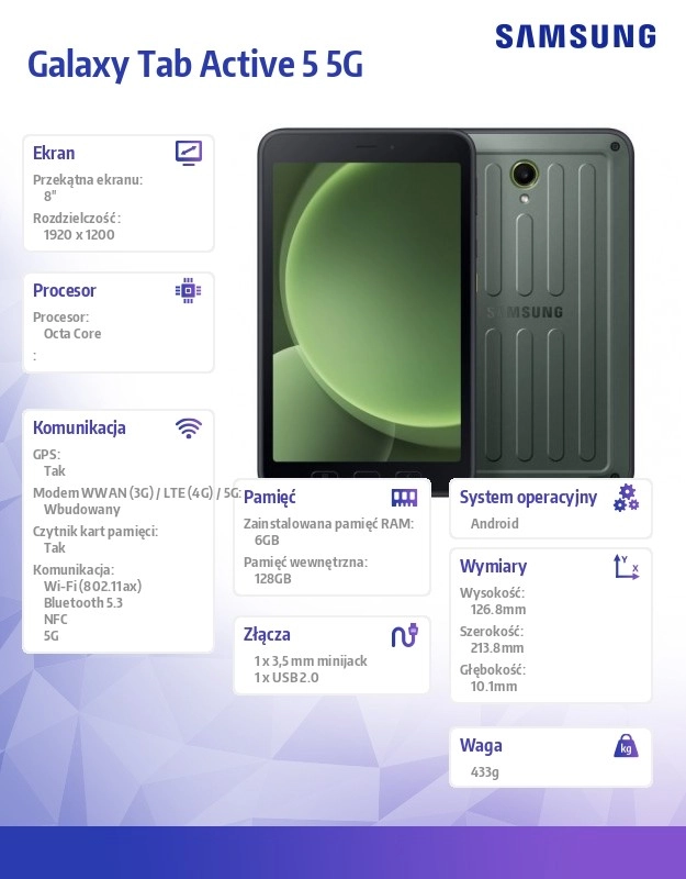 Samsung Galaxy Tab Active5 5G je robustan i izdržljiv tablet, idealan za poslovnu upotrebu. S naprednim značajkama i snažnim hardverom prilagođava se različitim radnim okruženjima.