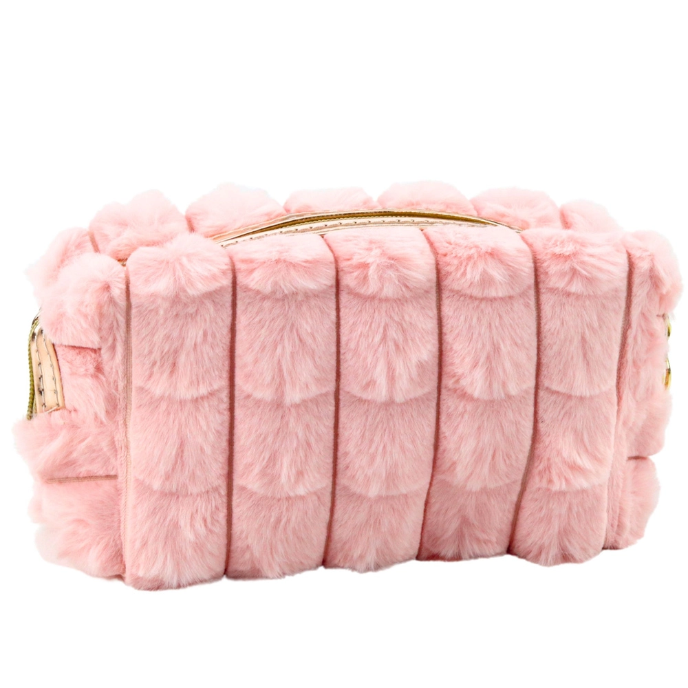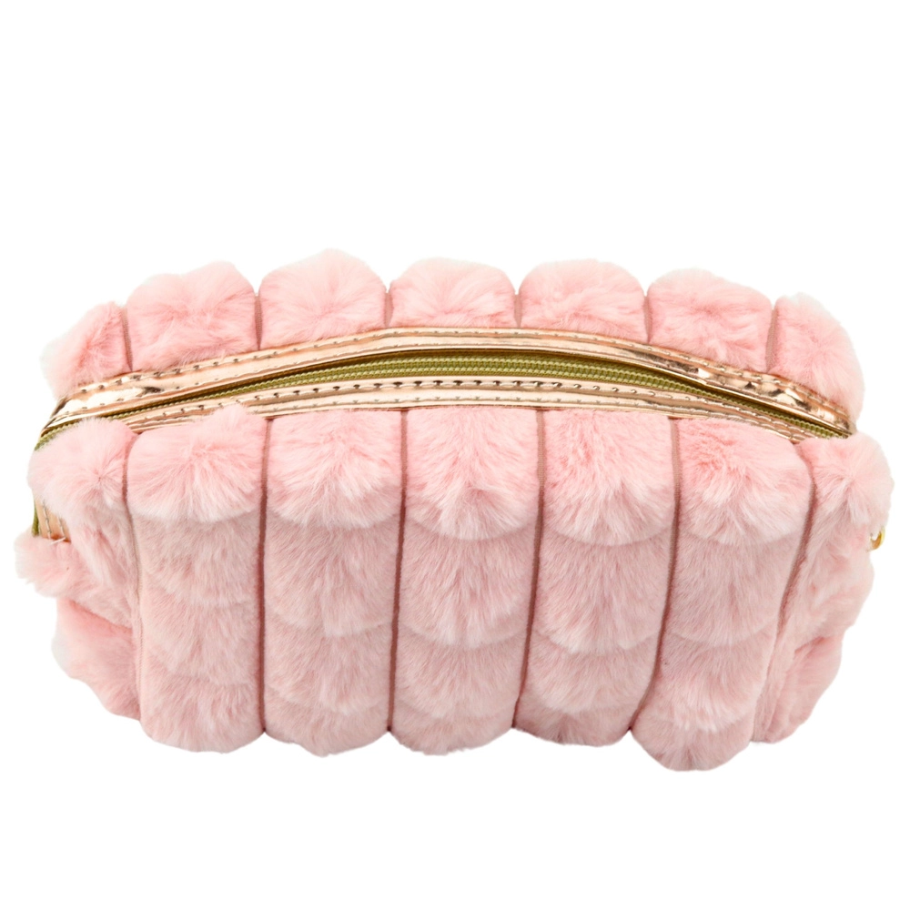 Elegantna i ugodna na dodir, plišana kozmetička torbica idealan je dodatak za svaki dan. Izrađena od mekog, plišanog materijala u nježnoj ružičastoj boji, ne samo da je vizualno privlačna, već se ističe i svojom praktičnošću. Njezin moderan dizajn savršeno se uklapa u aktualne trendove, a opremljena je sjajnim patentnim zatvaračem i ukrasnom ručkom u boji ružičastog zlata.