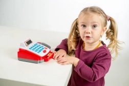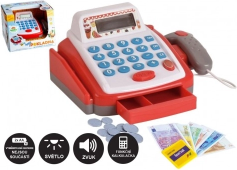 Ova kompaktna digitalna blagajna odličan je dodatak svakom dječjem dućanu. Zahvaljujući realnim funkcijama djeca će isprobati rad s novcem, skeniranje proizvoda i osnovno računanje. Blagajna je izrađena od izdržljive plastike, jednostavna je za upravljanje i svojim svjetlosnim i zvučnim efektima privlači na prvi pogled.