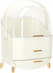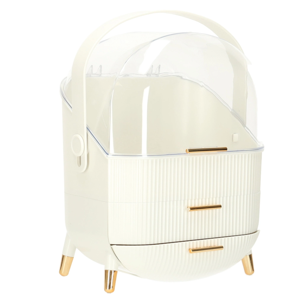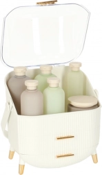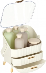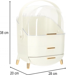 Predstavljamo vam bijeli kozmetički organizer s ladicama, koji pomaže održavati vaše kozmetičke proizvode i nakit u savršenom redu. Ovaj organizer opremljen je s dvije prostrane ladice i prozirnim poklopcem, koji štiti vaše stvari od prašine i istovremeno ih lijepo izlaže. Elegantna forma ovog organizer s zlatnim detaljima daje svakoj kupaonici ili toaletnom stolu luksuzan izgled.