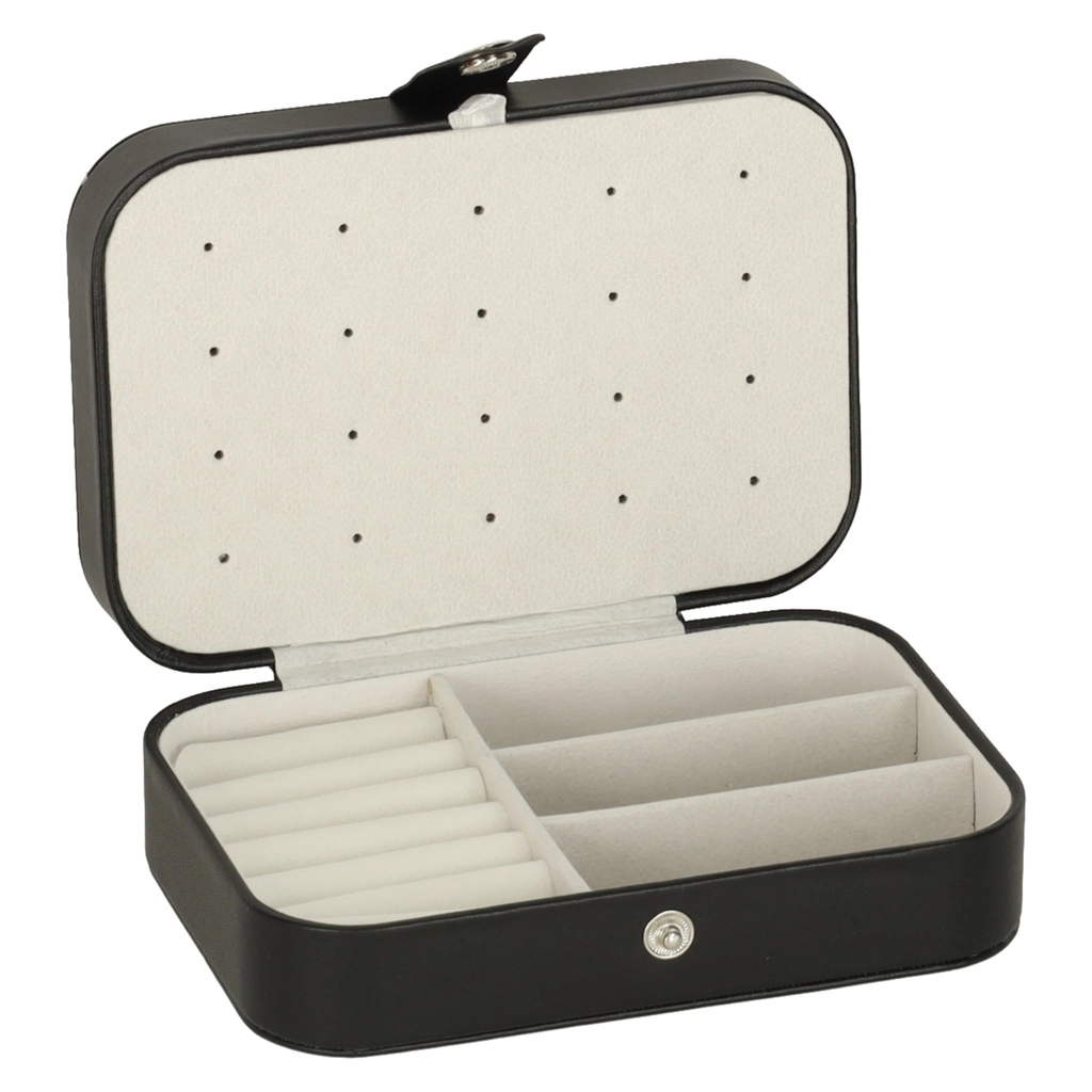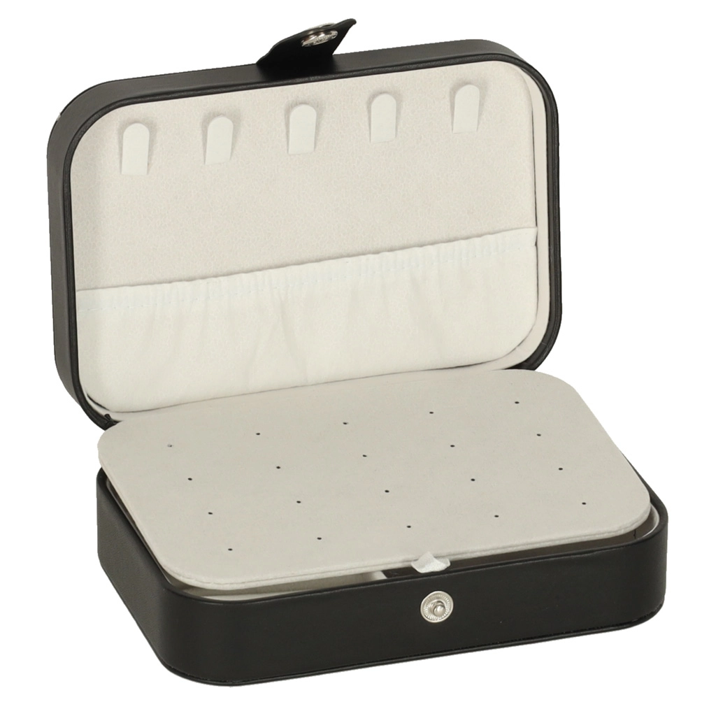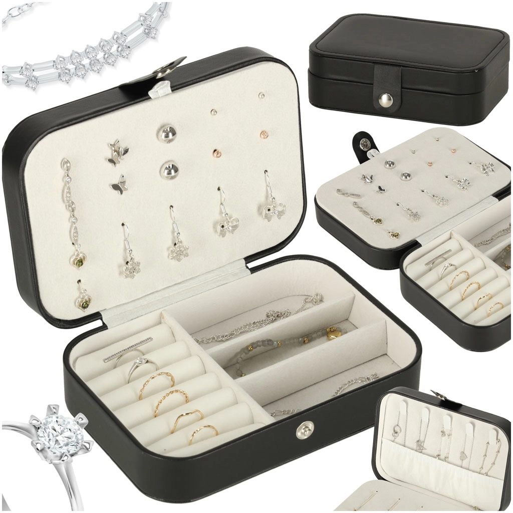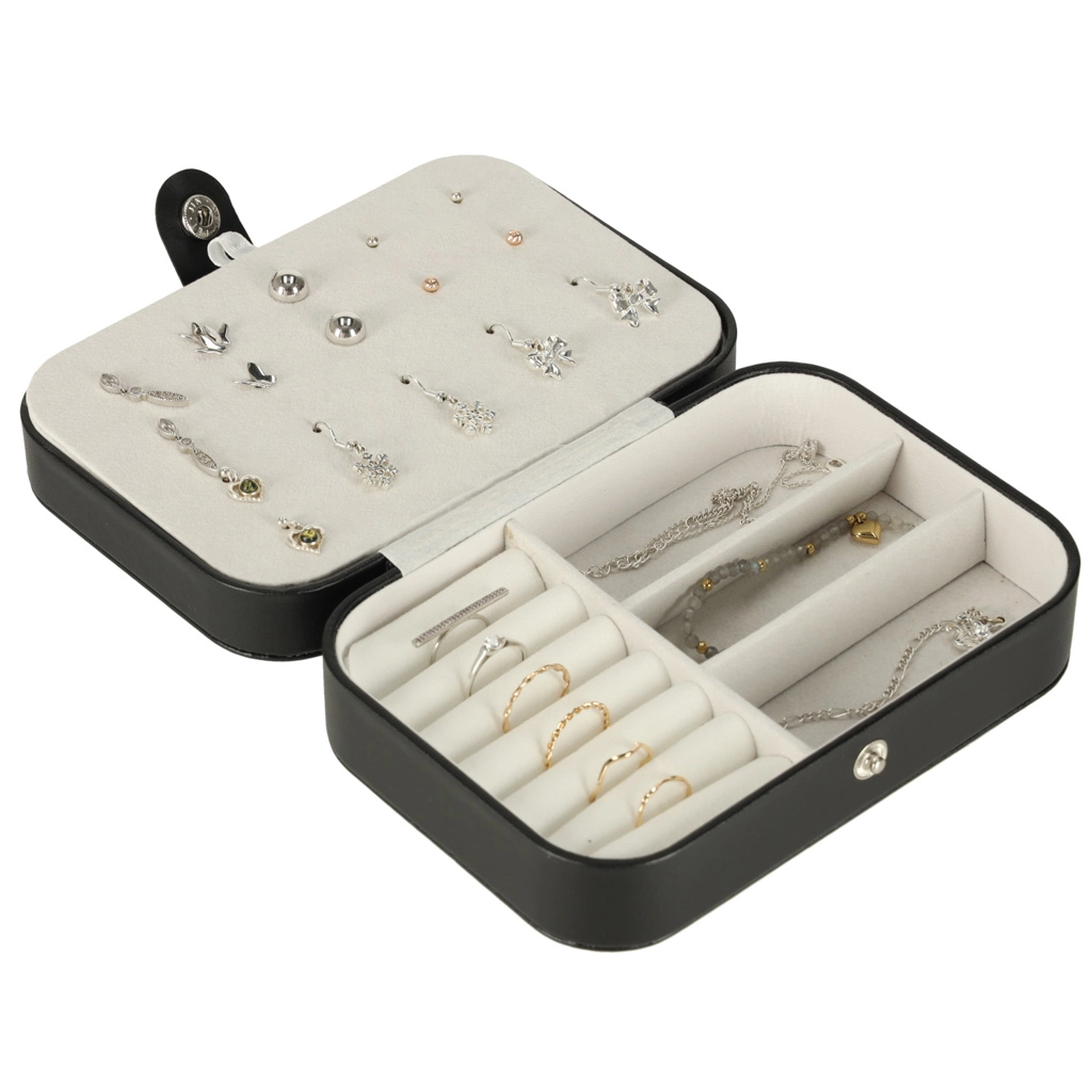 Elegantna putna kutija za nakit s promišljenim rasporedom za prstenje, naušnice, narukvice i ogrlice. Kompaktne dimenzije, sigurno kopčanje na druker i mekana podstava štite nakit kod kuće i na putu. Nudi 12 mjesta za prstenje, panel za 10 parova naušnica, pretince za sitnice i 5 kukica s džepićem za lančiće.